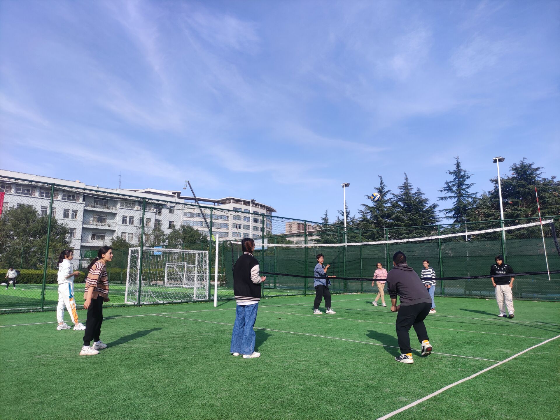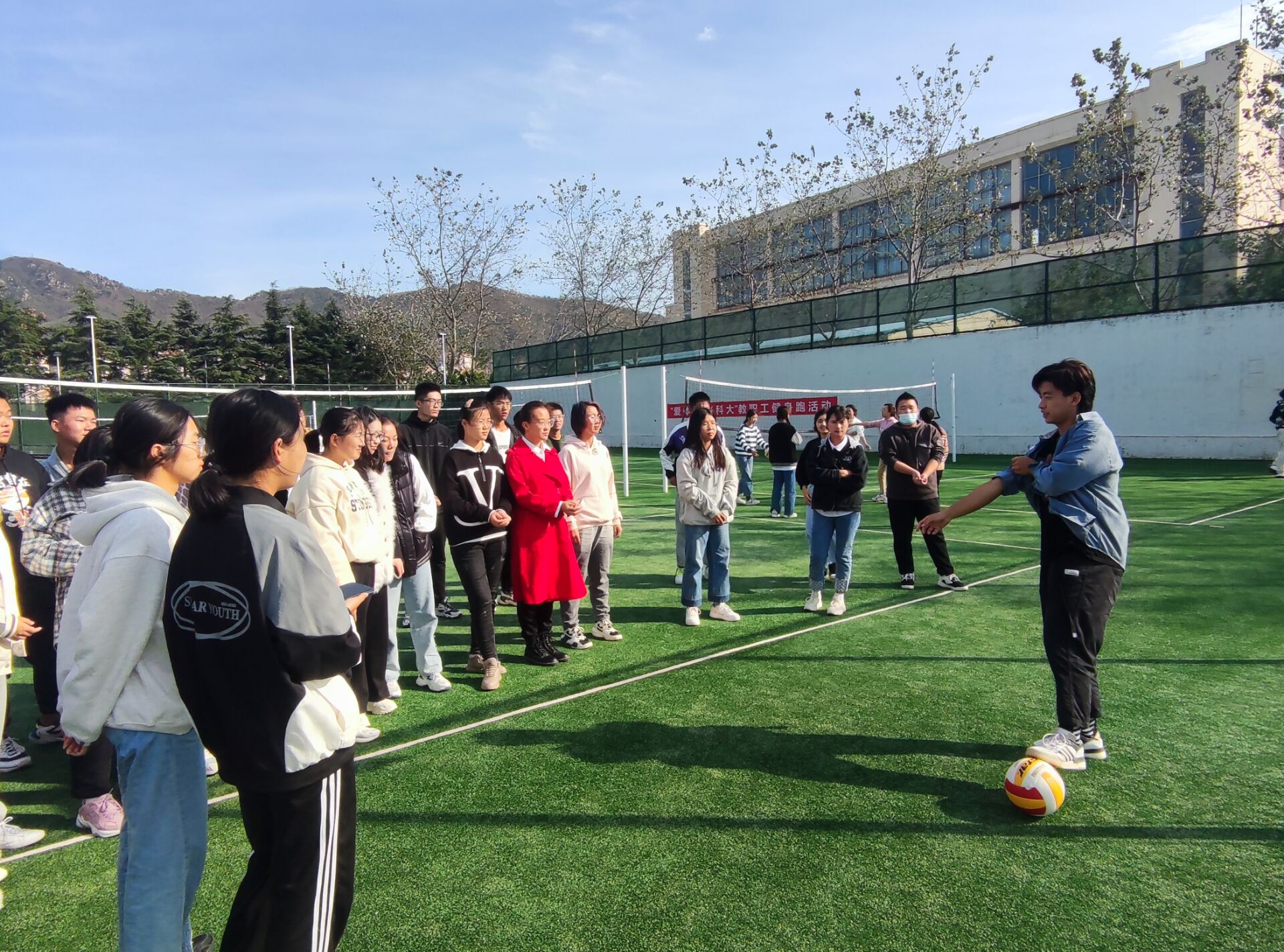 该活动于10月19日下午14:00在南苑排球场举行。活动主要分为教学和实践两个部分,首先带领同学们了解了排球的标准基础动作,如:对垫球、自垫球等。把每一个动作进行了细致的讲解,让没有排球基础的同学学习这些基础动作,练好最扎实的基本功。