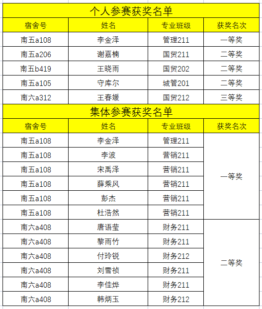 在个人赛中,管理211班员工李金泽获得一等奖,国贸211班谢嘉楠、国贸202班王晓雨、城管201班守库尔获二等奖,国贸212班王春媛获得三等奖;在集体赛中,南五A108宿舍六名同学获得集体一等奖,南六A408六名同学获得集体二等奖。