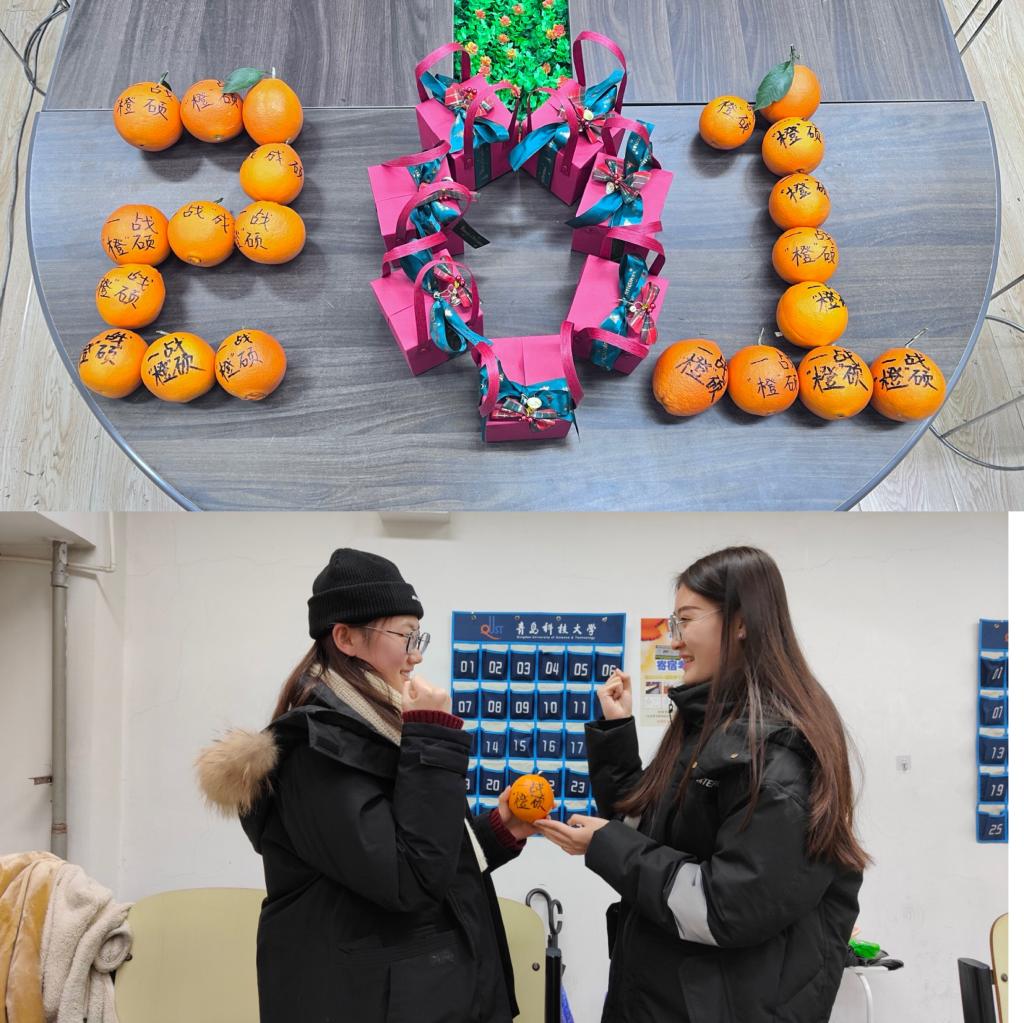 辅导员为考研的员工挑选了具有马到“橙”功、“苹”安顺利美好寓意的橙子和苹果,将祝福放入吉祥如意的红色纸袋中组成一个个凝结学院爱心的幸运福袋。