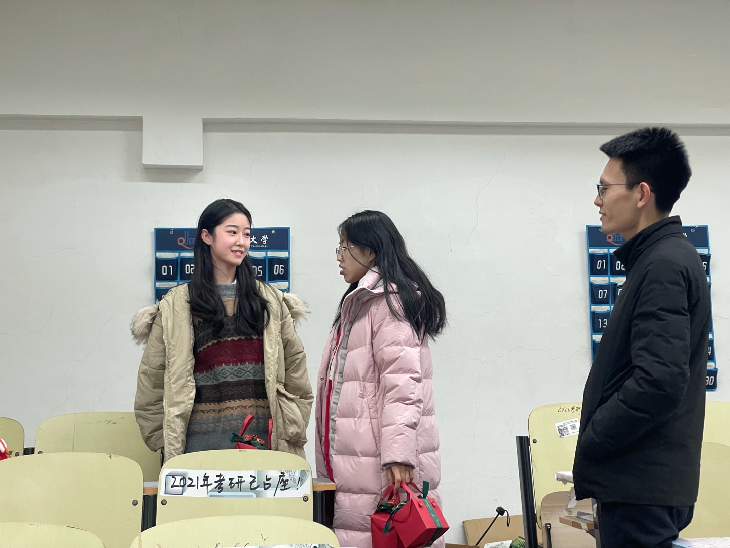“气温降低要做好防寒保暖“”宿舍要注意通风换气,保持空气流通“”明天就要考试了,注意身体,劳逸结合”......12月24日,2018级辅导员张晓帆、张显全去到教室和员工宿舍为考研学子加油打气,缓解考研学子紧张情绪,鼓励员工坚定信心,同时为全体考研学子送上了精心准备的小礼物,预祝员工金榜题名。