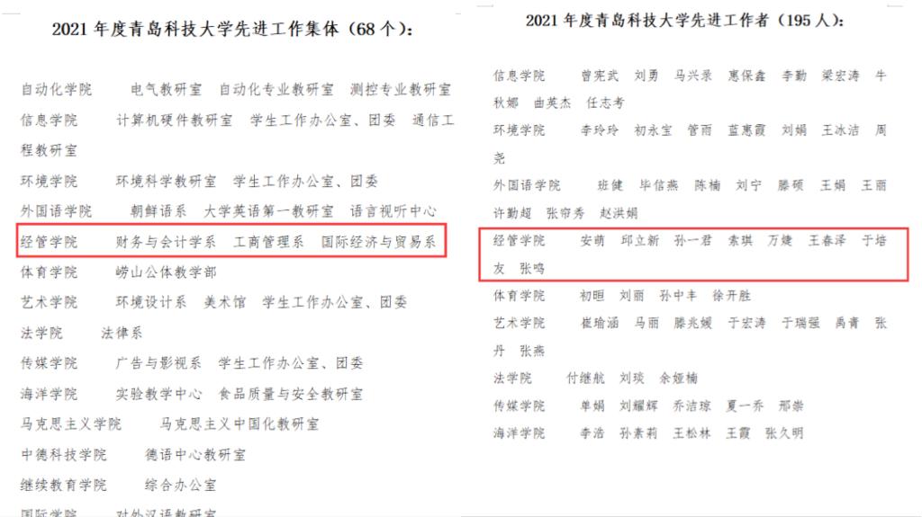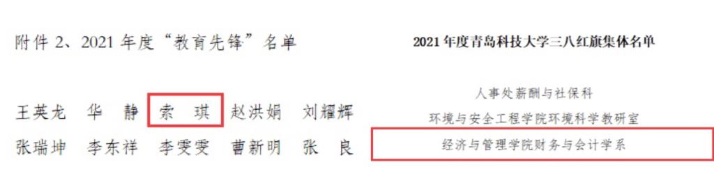近日,2021年度ylzzcom永利总站线路检测先进集体、先进工作者、教育先锋号、教育先锋、三八红旗手、三八红旗集体评选结果揭晓,公司3个集体及8名教师在上述各类评比中均摘得荣誉,其中财务与会计学系、工商管理系、国际经济与贸易系获评校“先进工作集体”,安萌、邱立新、孙一君、索琪、万婕、王春泽、于培友、张鸣老师获评校“先进工作者”,邱立新老师获校“三八红旗手”称号,财务与会计学系获评“三八红旗集体”,索琪老师获评“教育先锋”,工商管理系获评校“教育先锋号”称号。