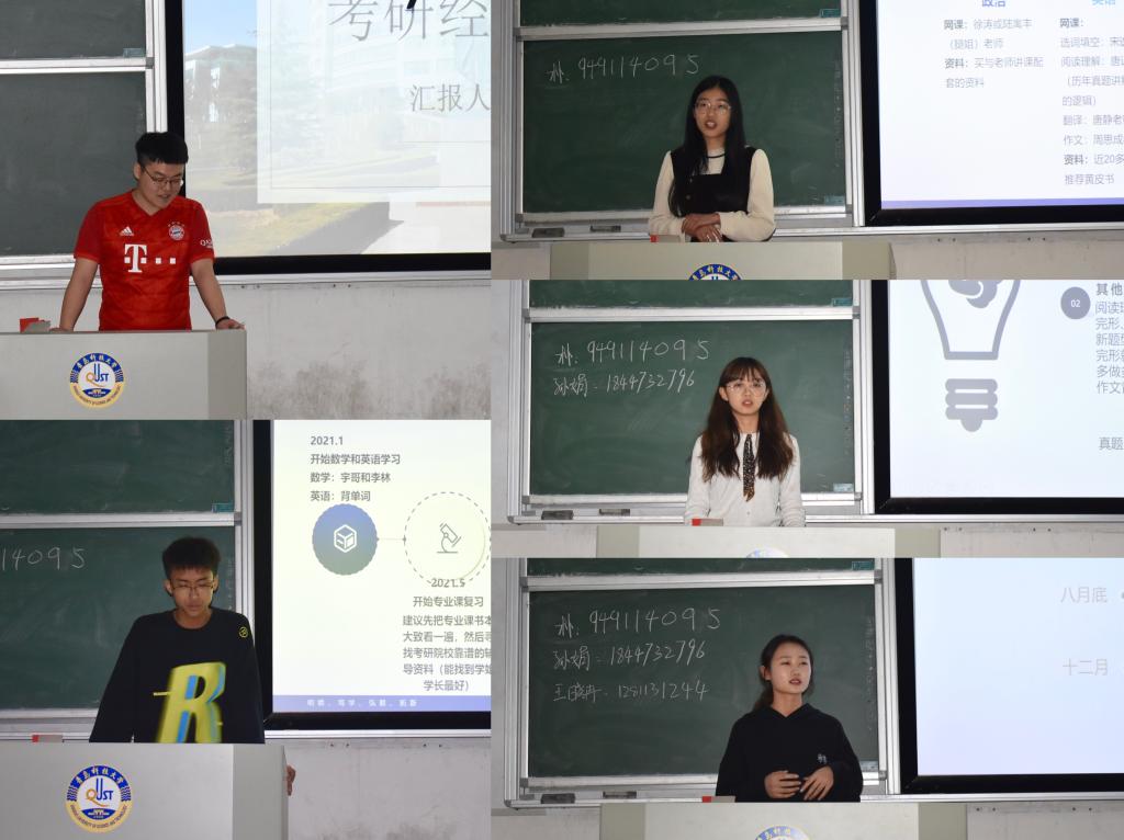 随后,六位考研成功的同学依次上台分享了考研经验,并与同学们面对面交流,解答疑惑,给出建议。朴在旭就院校选择、专业选择、信息获取及筛选等方面介绍了自己的成功经验;任栩青分享了自己的学习方法与时间规划以及调剂经验;孙娟详细介绍了数学、英语、政治、专业课的备考规划以及时间安排,并强调了平稳心态的重要性;王晓冉分享了自己备考管综的成功经验;马艺茹、孙晓琳就考研时间安排、资料获取、复试准备方面分享了自己的成功经验,并鼓励同学们调整好心态,相信自己。