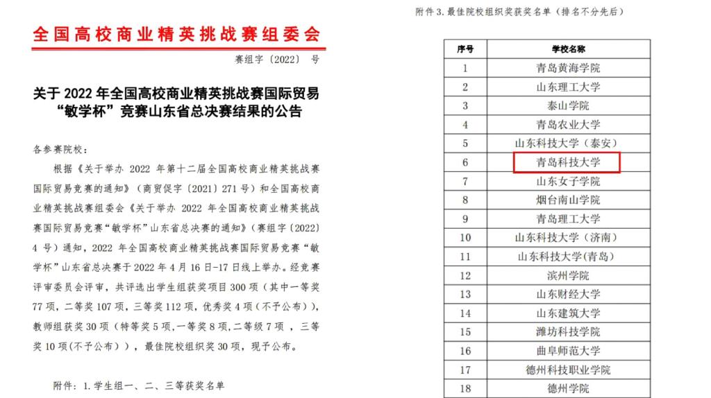 近日,2022年全国高校商业精英挑战赛国际贸易竞赛山东省总决赛竞赛结果公布。ylzzcom永利总站代表队荣获省级一等奖4项、省级二等奖1项、省级三等奖5项,学校获评“最佳院校组织奖”。