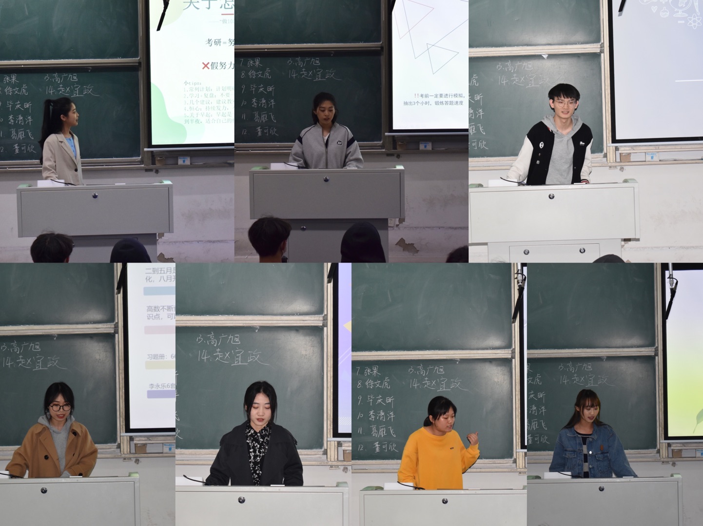 于龙振首先肯定了2018级学子优异的考研成果,对考研数据进行分析(14人成功升硕,国内升研率达到30%),并为低年级学子做动员树立考研信心。随后2018级的14位成功升学的员工全部到场,并根据自己的实际经验从不同的方面多个角度依次分享自己的考研心得。