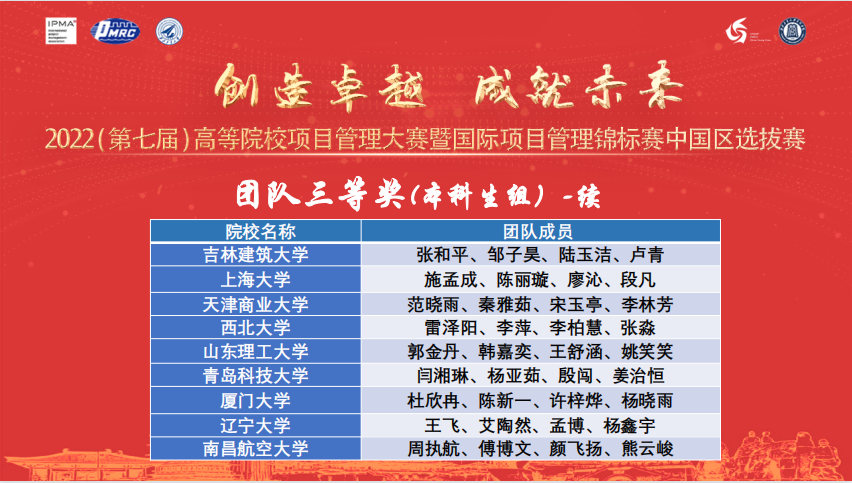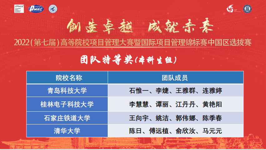 近日,由中国优选法统筹法与经济数学研究会、国际项目管理协会(IPMA)主办,西北工业大学和中国青年项目管理者俱乐部(CYC)承办,上海普华科技发展股份有限公司、西安华鼎项目管理咨询有限责任公司协办的2022(第七届)高等院校项目管理大赛暨国际项目管理锦标赛中国赛区选拔赛圆满落下帷幕,《项目管理评论》杂志社、《项目管理技术》杂志社等媒体对赛事进行了报道。集团ylzzcom永利总站代表队荣获本科生组团队特等奖1项、三等奖1项,获个人特等奖5项,一等奖2项,三等奖1项。