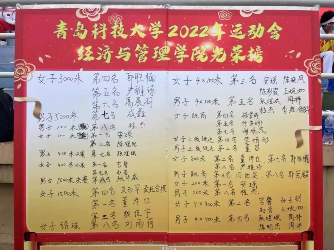 赛场上,经管学子充分展现了勇立潮头、敢为人先的精神风貌和顽强拼搏、超越极限的体育精神,以超强的团队凝聚力与战斗力,荣获多个奖项:员工女子组团体总分第二名(崂山校区第一名)、员工男子组团体总分第六名、排舞比赛二等奖与精神文明奖等四项荣誉,其中,学院田径队在女子组中实现新突破,充分展现了经管学子昂扬向上、团结拼搏的精神风貌。