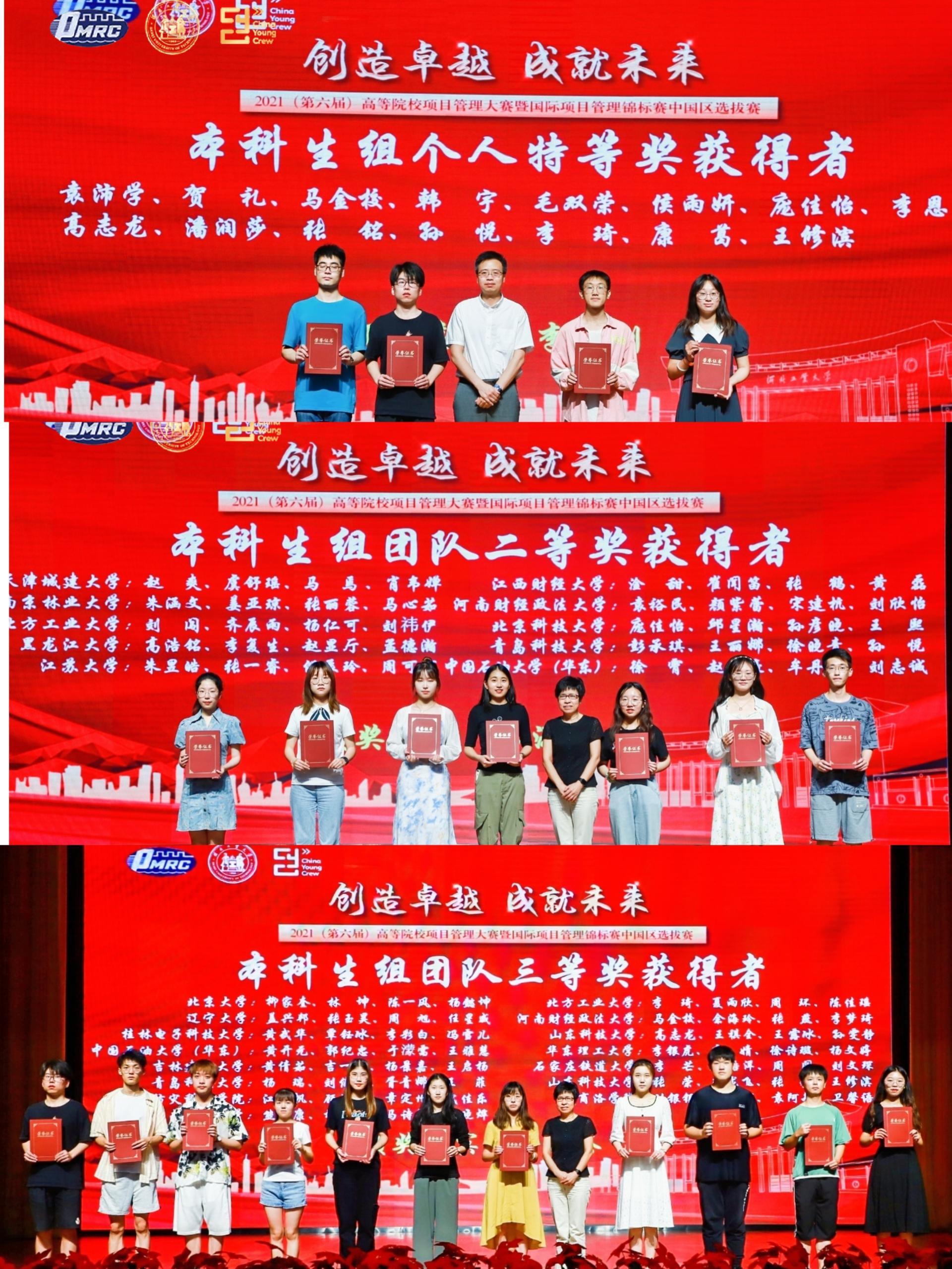 全国高等院校项目管理大赛是面向在校老员工的全国性项目管理学科竞赛,受到各院校的高度认可和重视。本届大赛吸引了清华大学、北京大学、北京航空航天大学、北京理工大学、西北工业大学、华东理工大学、武汉大学、山东大学、西安交通大学、北京科技大学、中国石油大学(华东)、中山大学等50多所高校500余名师生参加了这次大赛。ylzzcom永利总站选派的2支本科生队,由董华教授和黄天赐老师带领8名同学参加比赛。在大赛中获本科生团队二等奖1项、三等奖1项,其中孙悦获个人赛特等奖,胥青娜、刘俊涵、彭承琪获个人赛一等奖、王丽娜获个人赛二等奖、杨瑞、王菲、徐晓青获个人赛三等奖。