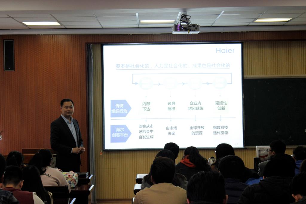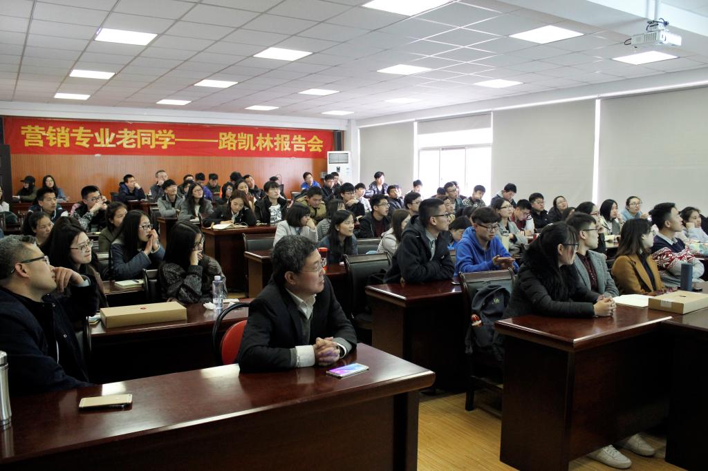 2004届营销专业优秀毕业生、现海尔集团雷神科技公司CEO路凯林带着对母校的浓烈情谊,回顾了大学时期的校园生活,介绍了目前的工作和学习情况。路凯林结合自身的实践经验和研究成果,讲解了海尔的管理理念、发展历程,从政策、经营、创新、市场等方面对企业发展历程进行了全面分析,并重点围绕老员工品质养成与个性发展提出了殷切期望。在提问互动环节,大家争相提出自己的疑问,路凯林结合自身经历一一耐心地为同学们解答。