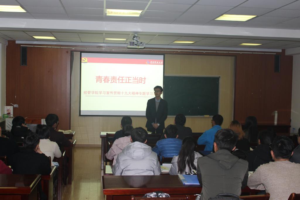 会上,张显全首先介绍了学院2017年取得的优异成绩,并对新生入校以来参与的活动进行了总结,希望员工干部能够各尽其责,继续做好带头作用。随后,张显全对课堂日常纪律和宿舍文化建设进行了要求。希望各班班长、团支书以身作则,时刻谨记责任,坚持团结协作,努力调整心态,不断带领班级同学努力前进。接着,王景雯带领大家就早操宿舍卫生养成教育、请假销假管理办法、纪律处分管理规定等进行了认真学习。最后,张显全与班委会、团支部成员围绕班级学风建设、班级管理、养成教育等多方面进行了探讨和交流,他认真听取了同学们的发言,对同学们提出的问题进行了详细解答。