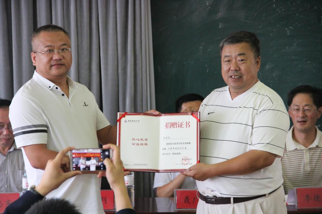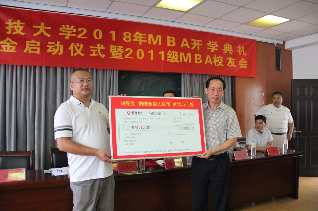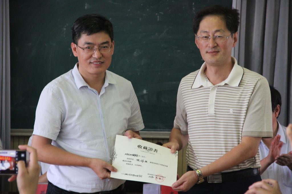 2011级MBA员工刘亮亮捐赠基金,张元利为他颁发捐赠证书。