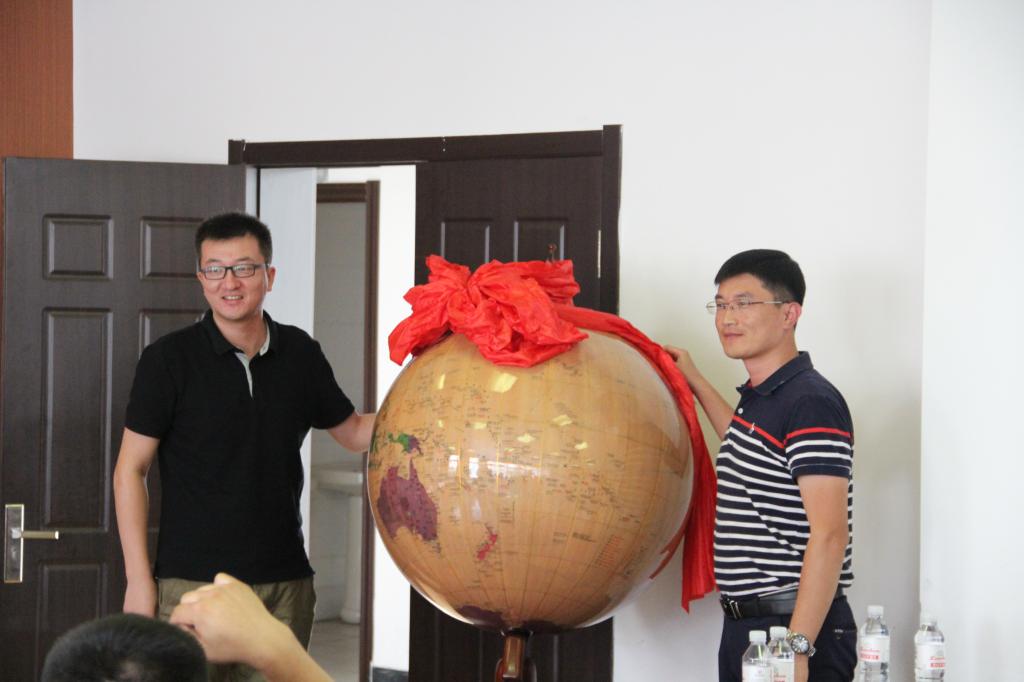 2011级员工捐赠地球仪,李德成教授为他颁发收藏证书,李德成指出感谢员工们的慷慨助学,学院将严格按照捐助者的意向和学校教育发展基金会的规定,将基金全部用于资助贫困员工,奖励品学兼优的员工,做到账目清晰,绝不挪用,请员工们放心。