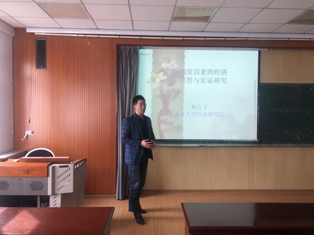 接着,杨友才教授与大家分享了题目为《引入制度因素的内生经济增长模型》的论文。该论文发表在权威杂志《学术月刊》(在综合类杂志排第二,仅次于《中国社会科学》)上。杨老师本次学术讲座的目的主要有两个方面:一是以该文章为例向同学们介绍如何规范地撰写数学模型类文章。首先是如何通过理论假设抽象的逻辑演绎构建经济数学模型。其次,如何对模型深入解读。如对模型均衡点存在性、稳定性和经济增长的平衡路径以及收敛速度的求解把数学逻辑严谨之美给以展示,其作用机制予以科学解读。这就令人信服地告诉大家经济学加入数学使得其科学性得到了充分保障和体现;二是,制度是决定经济长期增长的主要因素之一,中国供给侧改革的重点之一是通过各种制度改革推动技术进步,加快经济结构转型升级。杨经理的分享引起了同学们的强烈关注,老师、同学们与他积极互动,深入探讨论文的创新之处。