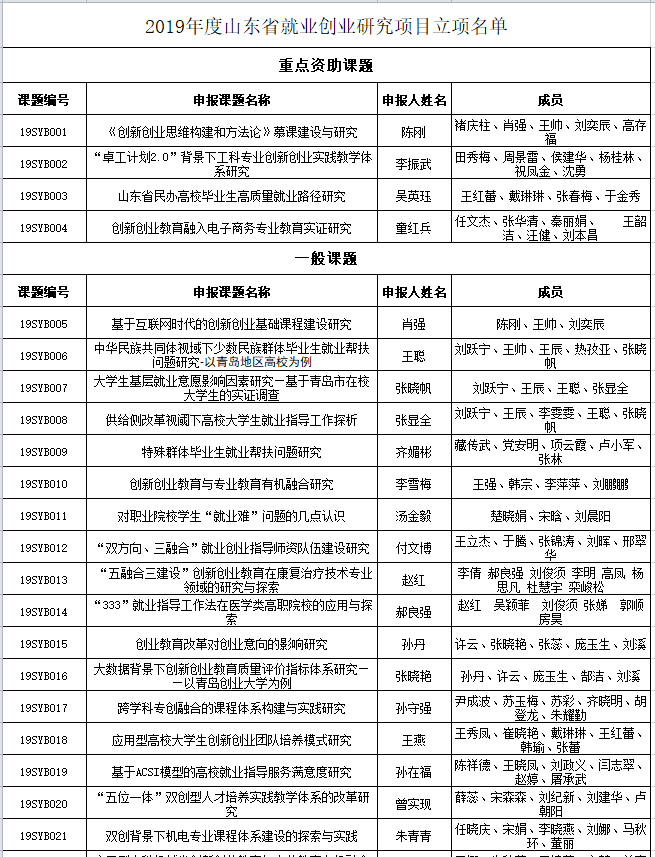 为全面贯彻习近平新时代中国特色社会主义思想和党的十九大精神,全面贯彻全国教育大会精神,突出加强就业创业理论研究的前瞻性、应用性和实践性,进一步提升就业创业工作水平,山东省社会科学基金委员会于2019年2月组织启动2019年山东省就业创业研究项目申报工作。近日,经专家评审,最终确定山东省就业创业研究项目立项40项,重点资助课题4项。ylzzcom永利总站报送的项目中华民族共同体视域下少数民族群体毕业生就业帮扶问题研究-以青岛地区高校为例、老员工基层就业意愿影响因素研究—基于青岛市在校老员工的实证调查、供给侧改革视阈下高校老员工就业指导工作探析获批立项,取得3个立项的好成绩。