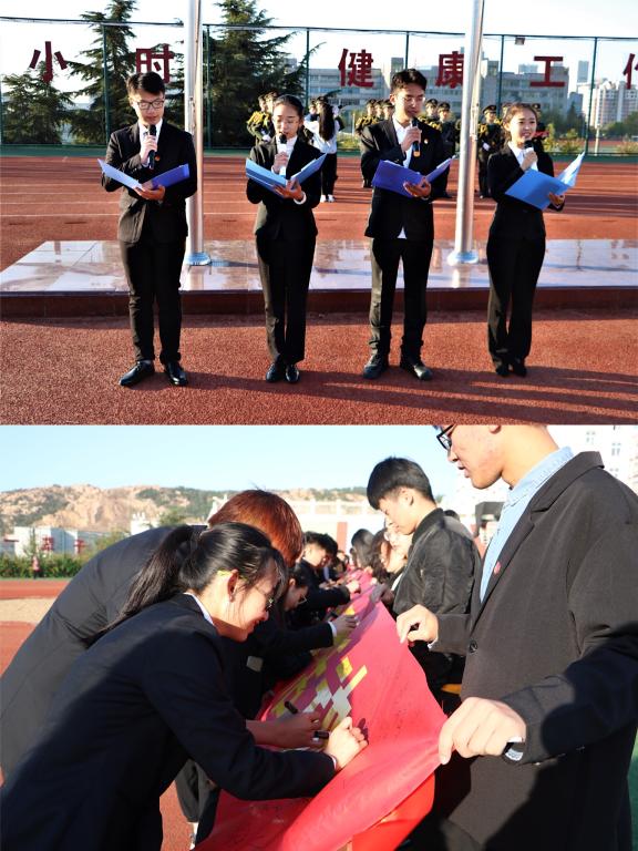 随后,全体师生面向国旗,高唱国歌,激发出经管学子接过时代接力棒、砥砺前行勇担当的无限热情。优秀员工代表、第34届员工会副主席肖映彤作了国旗下的演讲。他表示:“为了民族的复兴、国家的富强,我们要弘扬时代新思想,勇做时代弄潮儿。”接下来,由优秀员工邢筠秋、高煜婷、周志行、赵宜政朗诵了经典现代诗《我的祖国》,抒发了青年员工对祖国壮丽山河的无限赞美和建功立业新时代的精神风貌。员工会主席左靖雯作为领誓人带领全体员工面向团旗重温入团誓词,用青春梦激扬中国梦,让爱国情化为报国行。最后,全体员工在主题教育横幅上签字并留下对伟大祖国的美好祝福,以青春的名义共赴时代之约。