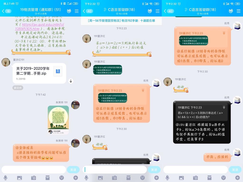 物流管理191、192团支部为帮助上学期期末考试中挂科和学习存疑较多的同学不耽误新学期的正常学习,成立了“C语言”QQ学习小组,通过资源分享、视频沟通等途径进行高效率、多趣味的线上答疑活动。学习小组中的“老师”认真履行自己的职责,耐心对自己的“员工”讲解学科的难点重点以及复习的技巧。小组成员们在学习过程中共同获益,共同进步,真正体会到“教学相长”的乐趣。