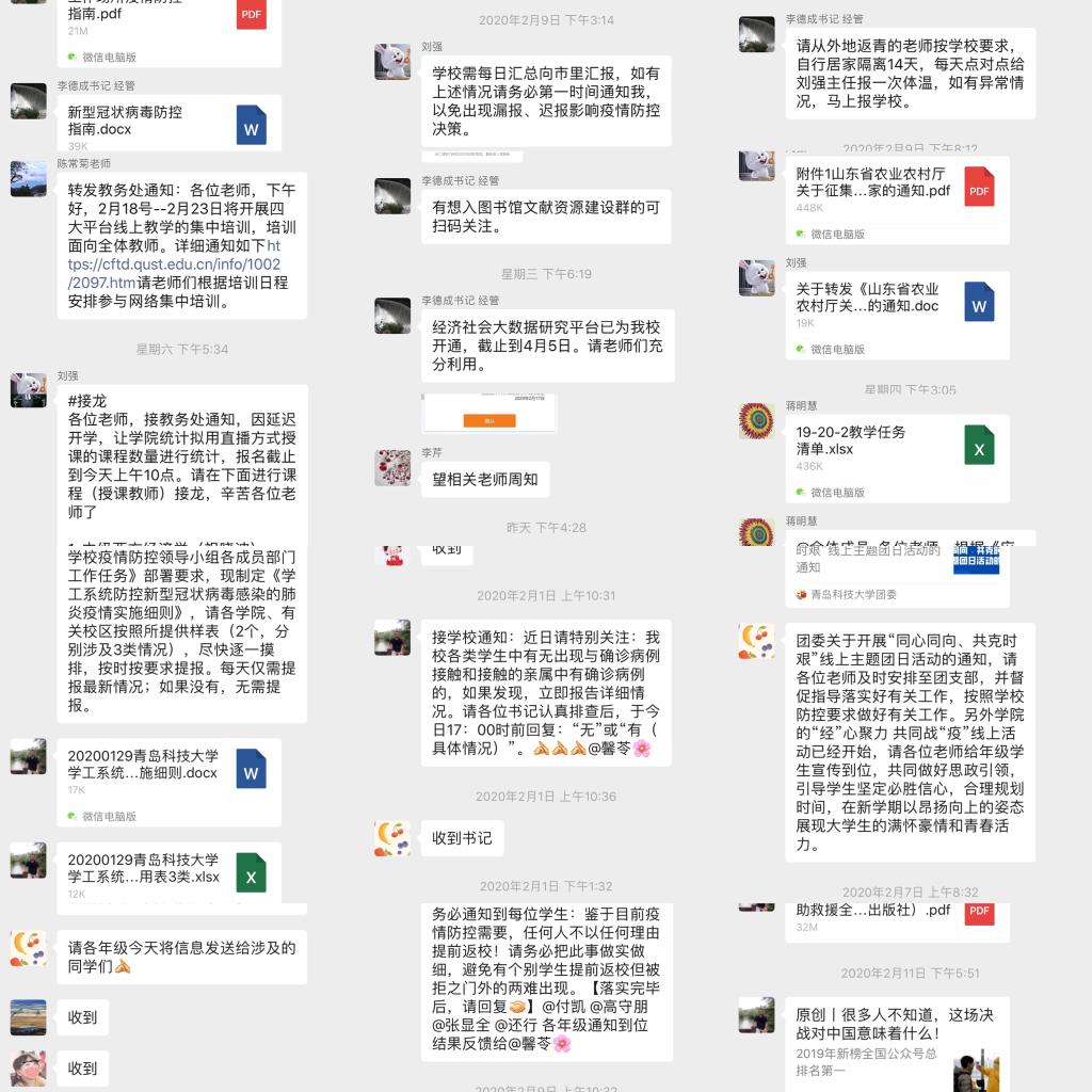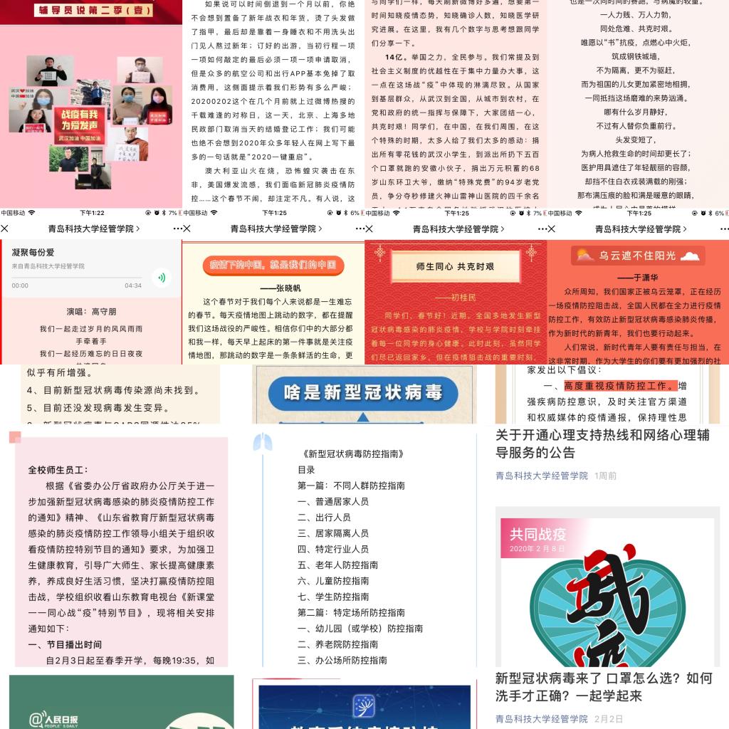 疫情期间,学院带领辅导员队伍立即进入工作状态,及时了解员工动态,做好思想引领工作,推出辅导员说第二季,以书信为媒介,引领员工坚定理想信念,打赢思想、管理、心理、平安四大疫情防控战。自“停课不停学”号召发出以来,学院围绕人才培养目标和各年级学习要求,为员工梳理好在线学习平台及在线学习课程,多种形式鼓励员工做好学业规划,任课教师督促并检查员工学习进度,辅导员组织同学们进行线上学习打卡及晨读活动,通过做好学业指导,引导员工合理规划时间,用好线上资源,做到停课不停学、疫情不恐慌。