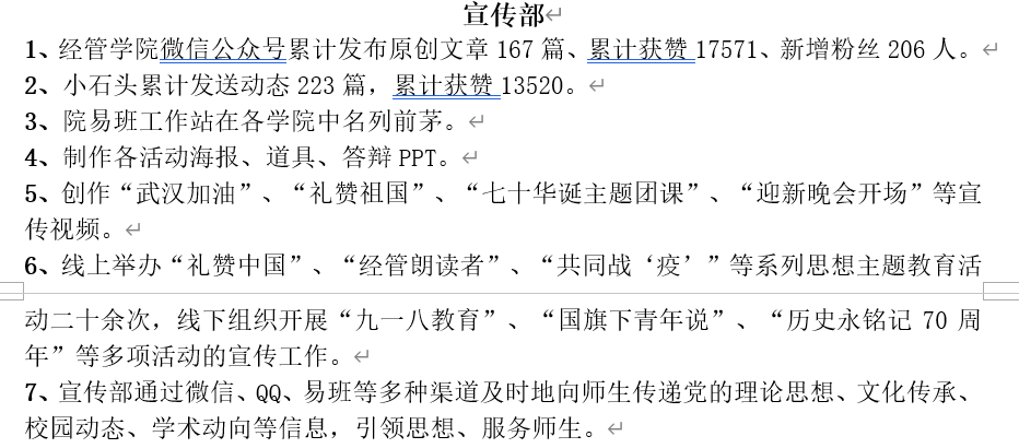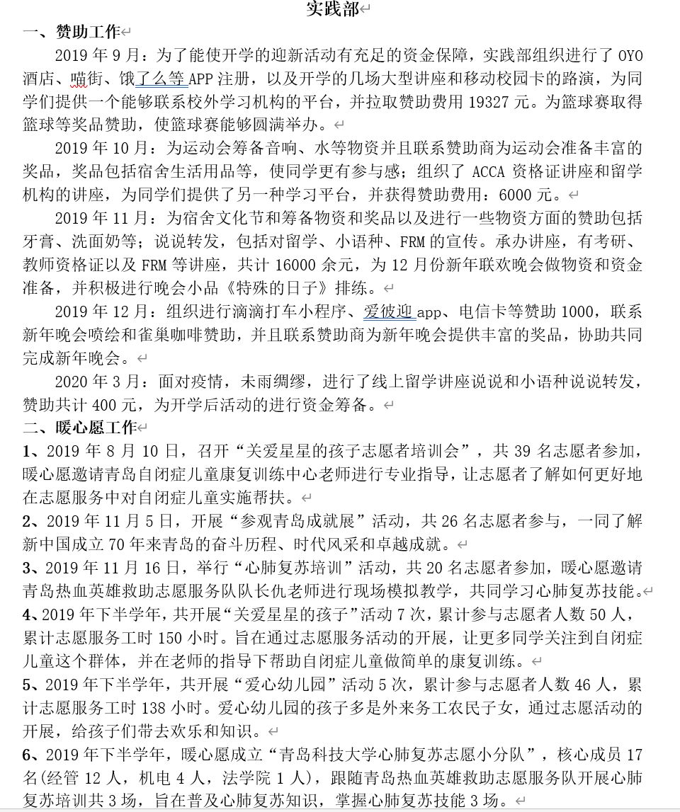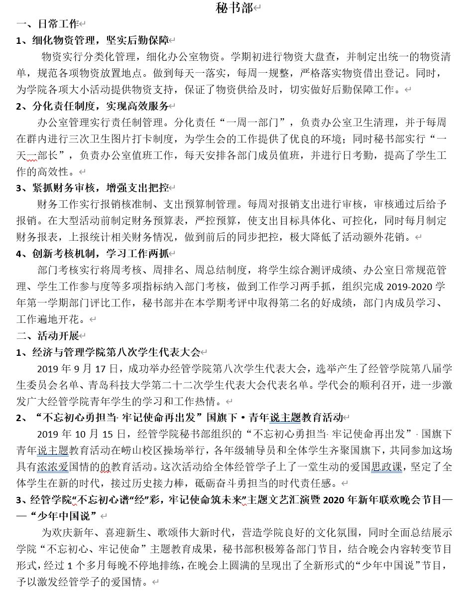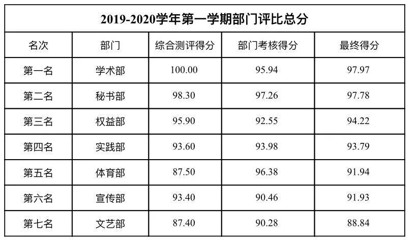 工作考核以部门为单位,分别从工作业绩和部门成员的学业成绩两个方面作为切入点,实行加减分制,结合上学期各个部门在部门建设、部门职能、部门管理等方面的表现进行评比,最终,严格按照部门评比细则,学术部摘得考核桂冠,秘书部和权益部以三分之差分列第二、第三,并授予其“先进工作部门”称号。同时,对于各部门综测成绩在前30%的成员授予“先进工作者”荣誉称号,按照奖罚分明原则,对在部门考核中位于后列的部门及部门成员施之惩罚,以促员工干部正确认识自己,发扬优点,弥补不足,提高工作效率,更好地发挥员工干部作用。