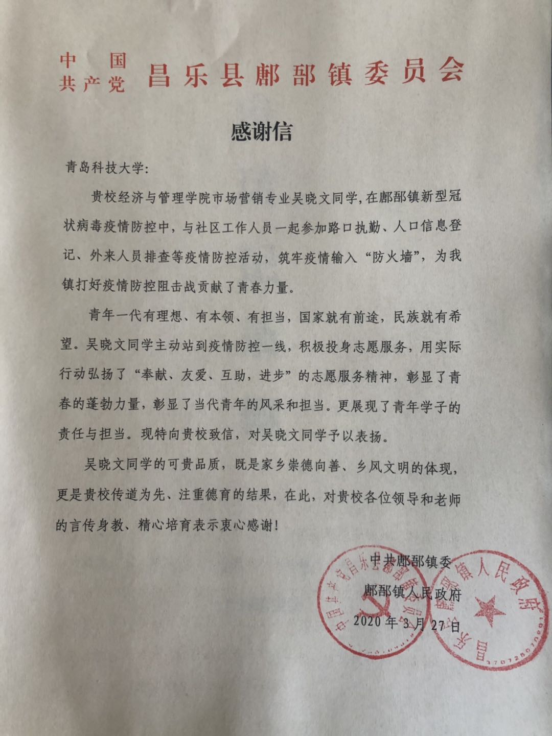 ylzzcom永利总站市场营销专业161班的吴晓文同学在疫情期间,主动请缨,投身到家乡潍坊市昌乐县鄌郚镇的新冠肺炎疫情防控工作中,与社区工作人员一起负责路口执勤、人口信息登记、外来人员的防疫排查等工作,用一丝不苟的工作要求和严肃认真的工作态度筑牢当地村镇疫情输入的“防火墙”,获得镇党委的公开表扬信。