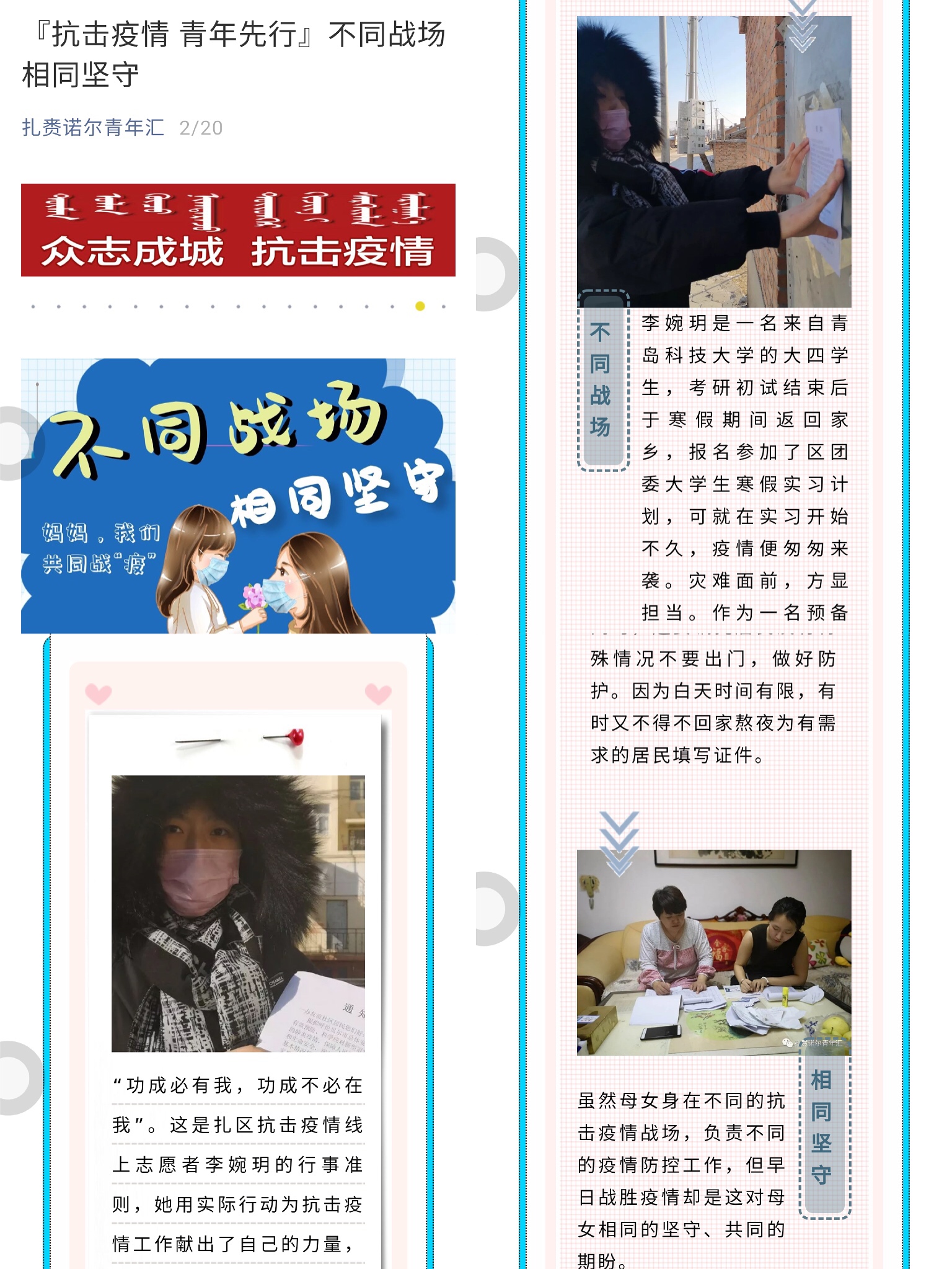 李婉玥是ylzzcom永利总站城市管理专业161班的一名中共预备党员,自放假后一直在呼伦贝尔市扎赉诺尔区政府团委实习。为积极参与到疫情防控工作中来,她义无反顾报名成为一名抗疫线上外宣志愿者,负责抗疫楷模报道和信息采编工作。截至目前,李婉玥向扎赉诺尔区团委供稿多篇,其中《与您并肩 我自心安》、《301国道上的“暖心大白”》等四篇文章在扎赉诺尔区团委公众号上进行发表,且得到中国新闻网、呼伦贝尔团委、呼伦贝尔新闻等各大媒体平台的广泛转载。同时,她与同为志愿者的妈妈经常一起加班加点,熬夜赶制居民出入证,保证居民日常生活平稳有序进行。李婉玥和妈妈的志愿者事迹被当地官微进行专题报道,对此,李婉玥表示,“哪里有疫情,哪里有需要,哪里就是主战场。关键时刻冲得上去,危难关头豁得出去,才能不负入党誓词!”