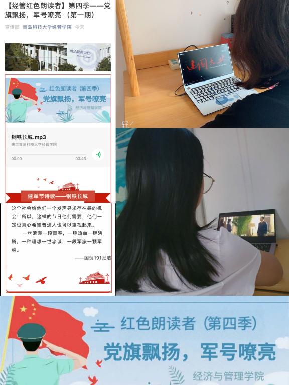 追寻红色记忆,筑牢思想之基。学院创新员工党支部特色活动“红色朗读者”展示形式,融入新时代强军主题,推出“党旗飘扬,军号嘹亮”第四季朗读系列及“军旗扬,军歌响”歌曲传唱活动,同学们感情真挚、字字铿锵,用作品诠释了爱国爱党爱军精神。通过官网、官微、易班等渠道开展的“同庆建军节,共叙鱼水情”活动中共收到画作、寄语、海报等优秀作品百余份,形式多样,富有创意,正面引导青年学子传承和发扬中国军人精神。