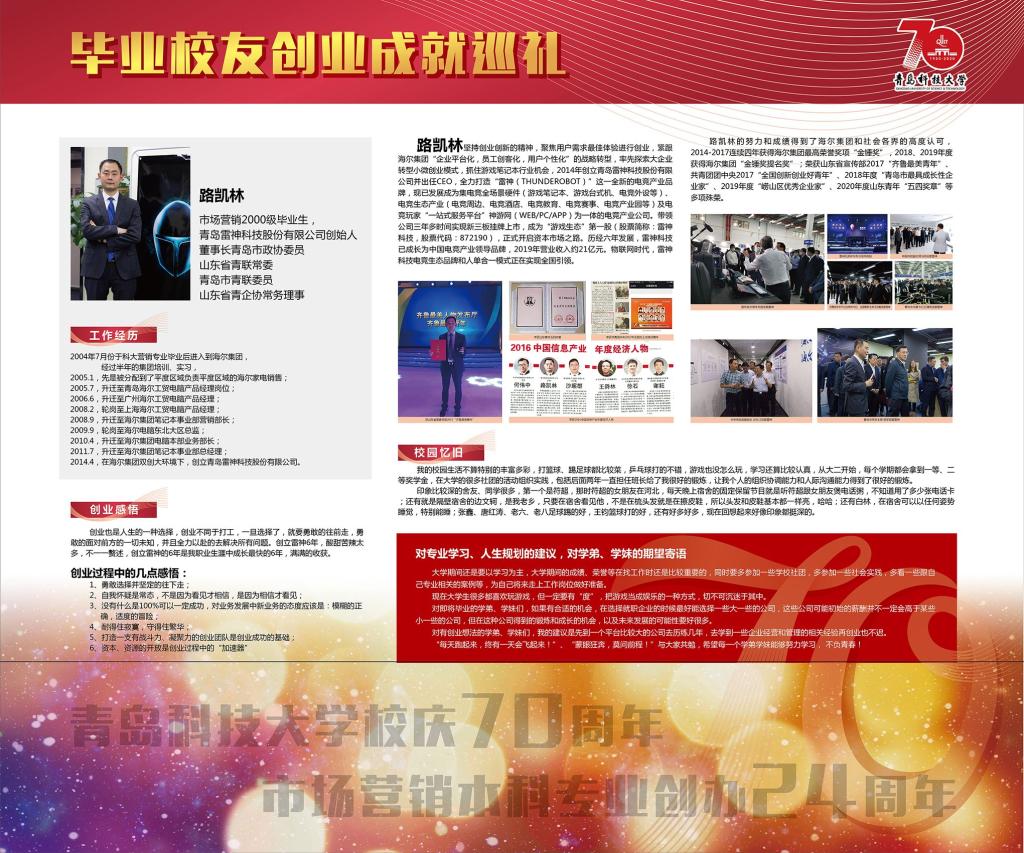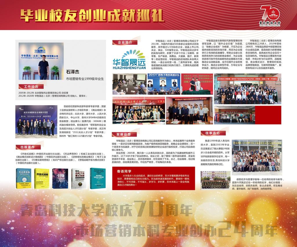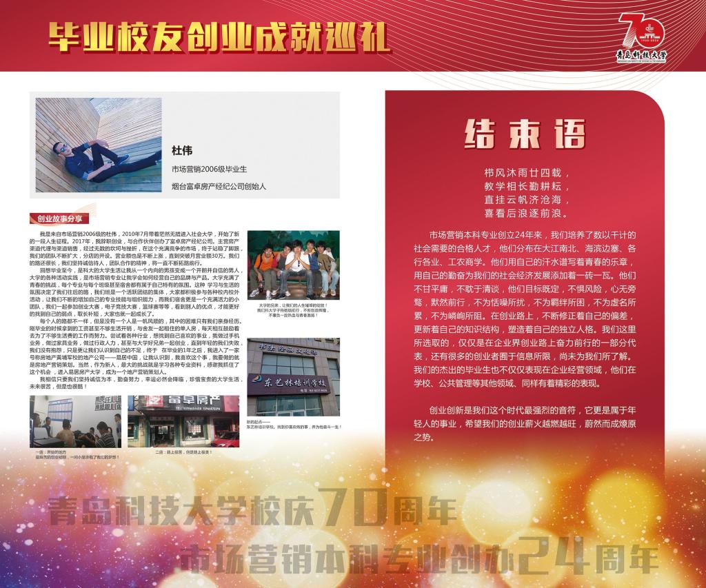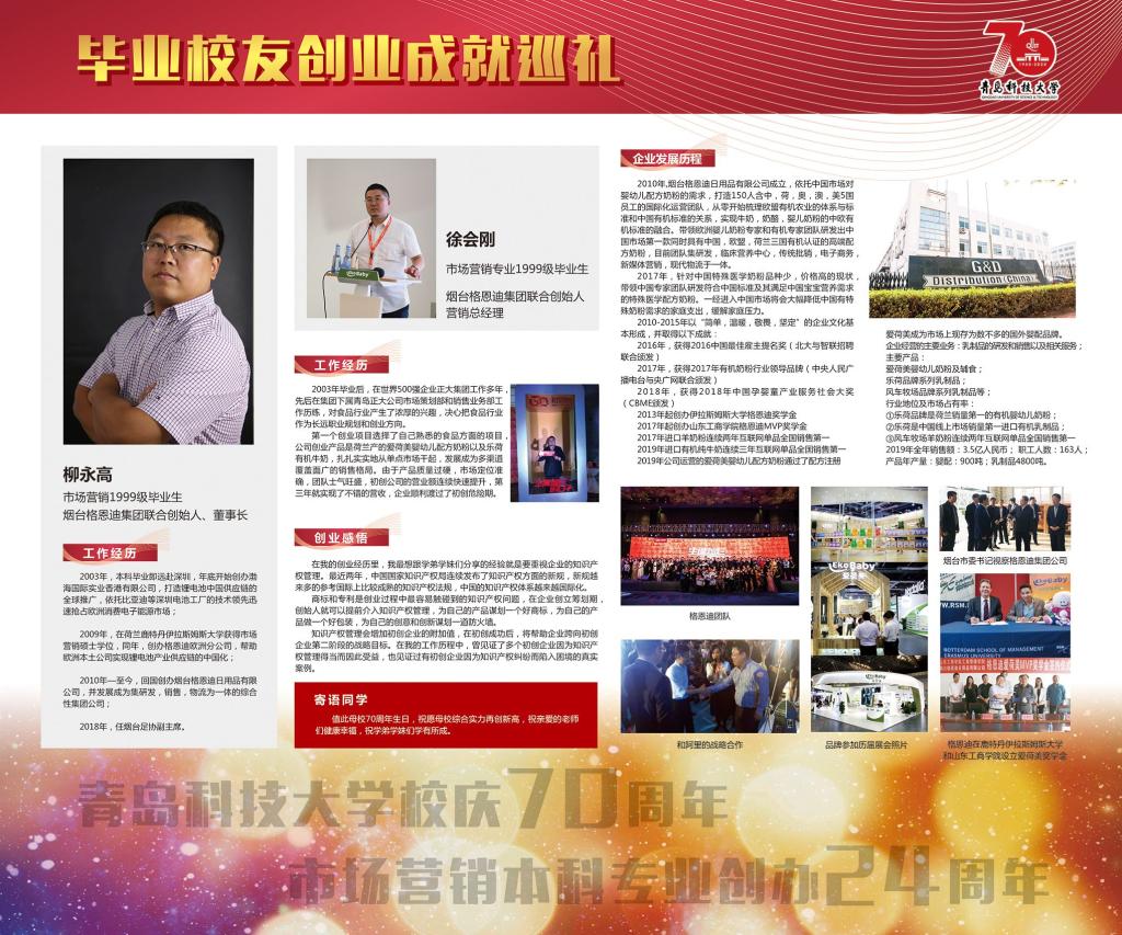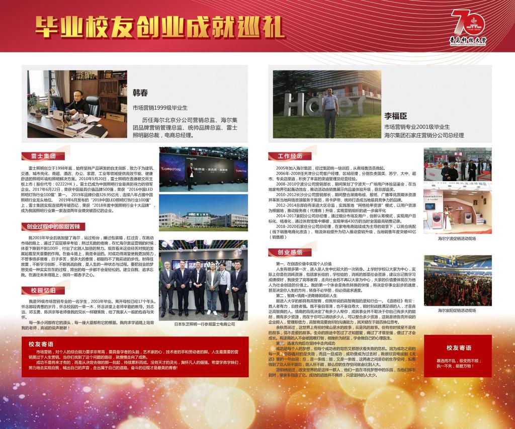 值此校庆70周年之际,公司市场营销本科专业创办满24周年,为此,ylzzcom永利总站市场营销系举办了毕业员工创业成就展览,收集了历届员工创业创新活动取得杰出成就的部分素材,制作展览栏于弘毅楼门口进行集中展示。