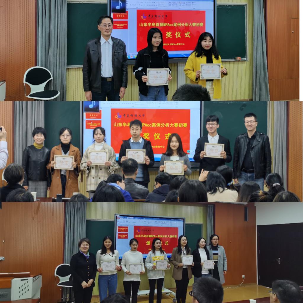 首先,由公司党总支书记李德成书记、副经理吕承超老师和副经理宫攀老师、MPAcc教育中心主任刘树艳教授以及财务与会计系张占贞教授为在山东半岛首届MPAcc案例大赛初赛中获奖的队伍颁奖,其中,获得一等奖的是:6的6次方队、MDZZ队;获得二等奖的有:菜的安详队、发际线总和我作队、我觉得对就队、第六感队、五小金刚队;获得三等奖的是重在参与组、非常5+1队、superego队、创新分析一级团队、帕累托效率队。