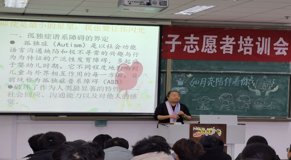 “关爱星星的孩子,让他们不在独自闪烁。”为了让志愿者们更好地了解自闭症儿童的情况,暖心愿邀请青岛市残疾人康复职业培训中心的高老师为志愿者们培训,高老师就自闭症的成因、症状以及发展趋势等方面对志愿者进行了详细介绍,为志愿服务活动的开展打下了良好的基础。