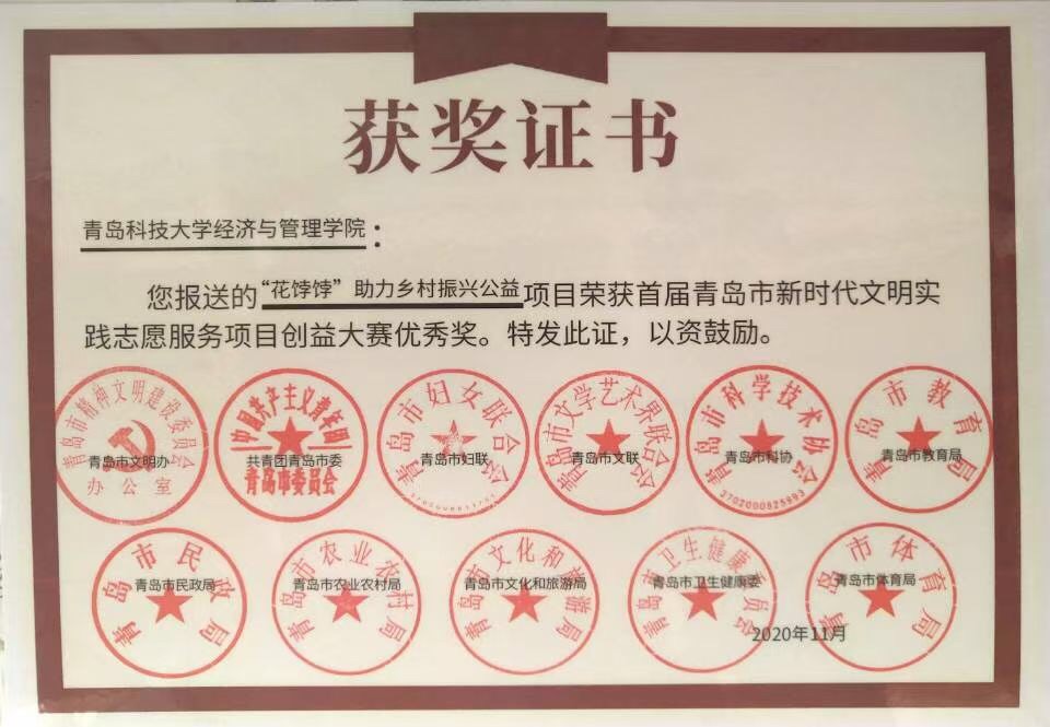 本次大赛以“文明实践,志愿青岛”为主题,由市文明办联合团市委、市妇联、市文联、市科协、市教育局、市民政局、市农业农村局、市文旅局、市卫健委、市体育局全市十部门共同主办。而此次,由公司学子长期运作的“花饽饽”助力乡村振兴公益项目在网络投票阶段从全市350余家单位、组织报送的共422个志愿服务创益项目中脱颖而出,成功晋级决赛,并最终以优异成绩斩获“优秀奖”殊荣!