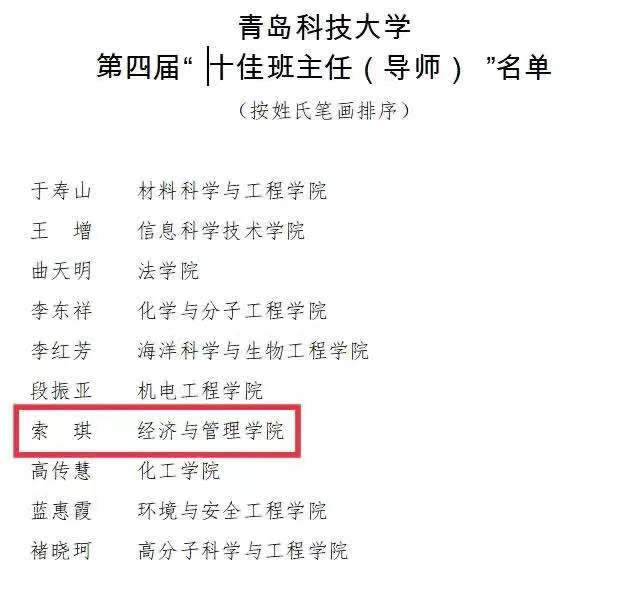 据悉,本次评选经各学院(校区)考核推荐,学校选拔,并经员工评议、网络投票、学校评审并公示等环节,最终选出10名第四届“十佳班主任(导师)”。在担任班主任(导师)过程中,索琪积极投身到老员工思想政治教育和学业指导工作中,在员工思想教育、作风养成、学风建设、素质提升和班集体建设中发挥了重要作用,为促进老员工全面发展、成长成才做出了重要贡献。