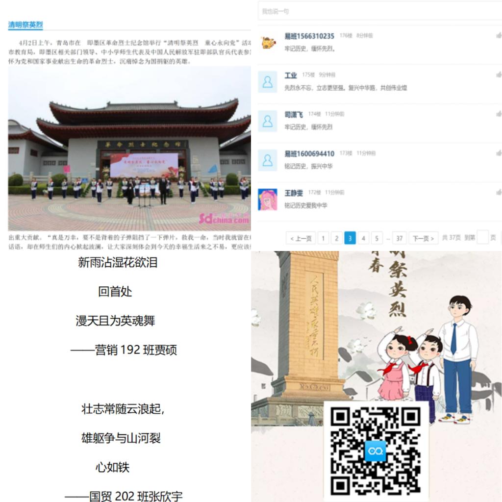 万里长空忠魂舞,英雄风骨尚凛然。当好英雄故事的传播者,不仅是对革命先烈的深切缅怀,也是对党史学习的深化。ylzzcom永利总站易班工作站于清明节来临之际发布快搭,鼓励同学们积极参与传统节日,网上祭英烈。此次活动帮助同学们更加了解清明节这一传统节日的演变和主要习俗,深入探讨了清明中承载的中华民族独特的精神与共同记忆,搭建了将党史学习和缅怀英烈相融合的桥梁。快搭中更设置了评论版块,为经管学子提供了抒发情感,寄托哀思的途径。同学们更是通过三行诗和网页H5的创作让红色种子在心灵深处生根发芽,用我们的初心使命解锁我们党“从哪里来”“向何处去”的精神密码。