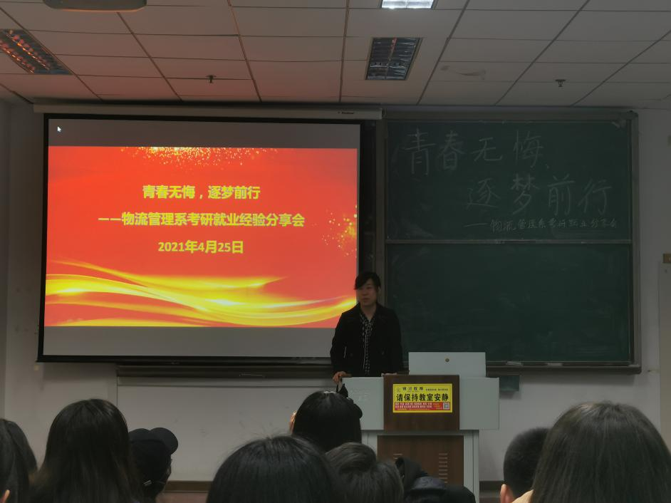 4月25日晚,物流管理专业于明德楼322教室举办“青春无悔,逐梦前行”考研考公经验分享会。此次分享会邀请了2020年考研、考公成功的七位学长学姐为参加分享会的18、19和20级同学进行面对面的经验分享与交流。会议由物流管理系主任索琪主持。