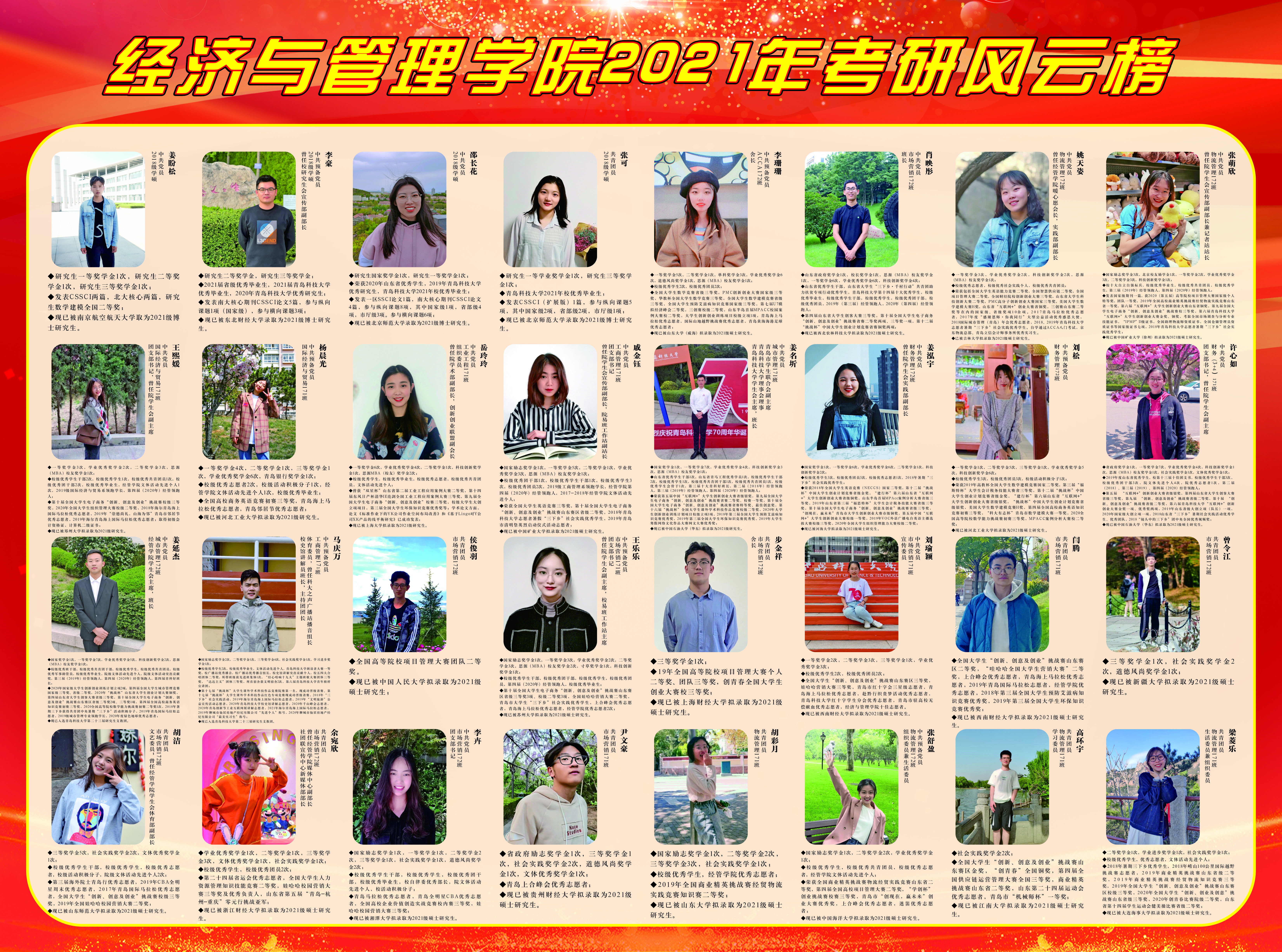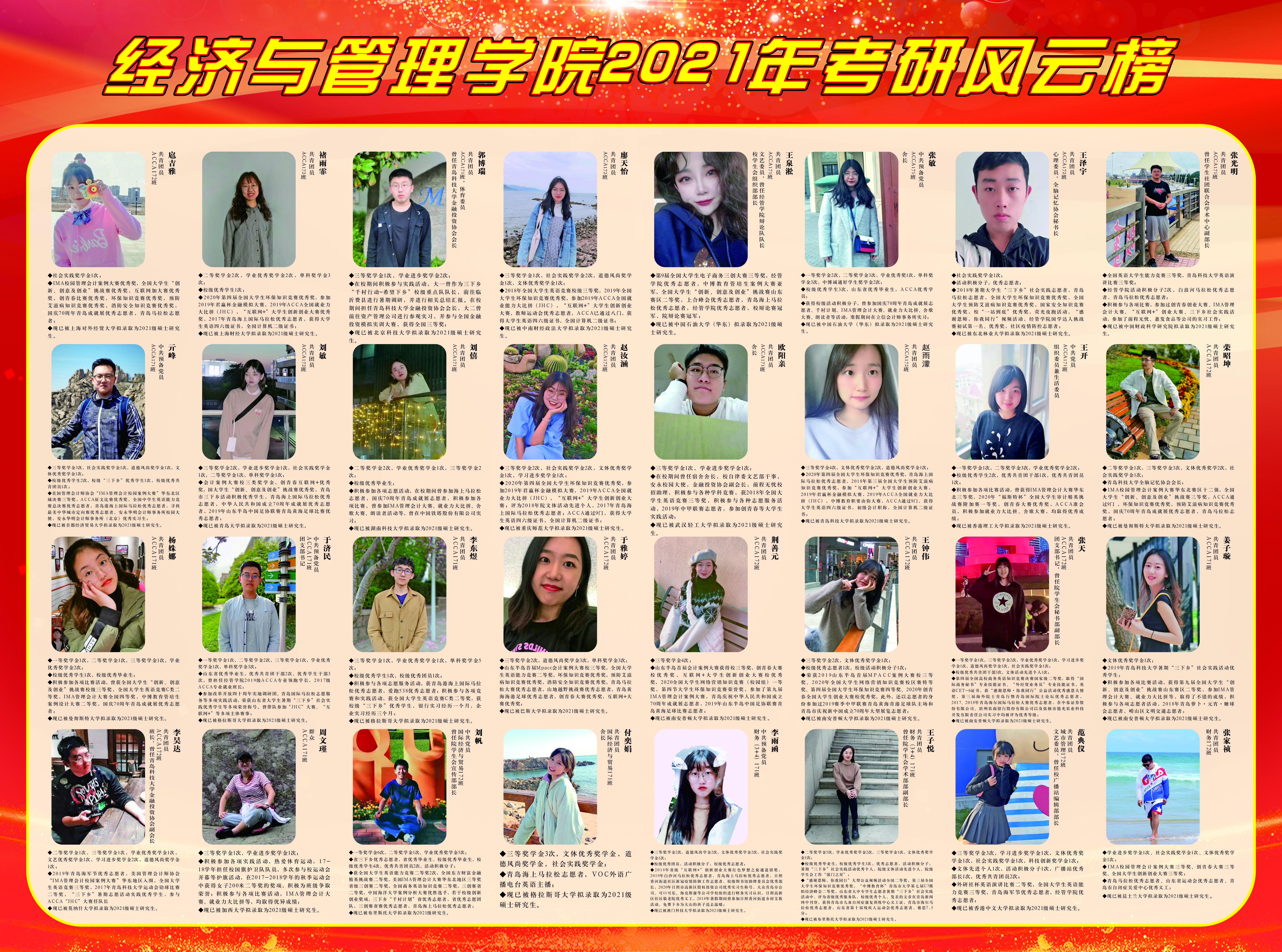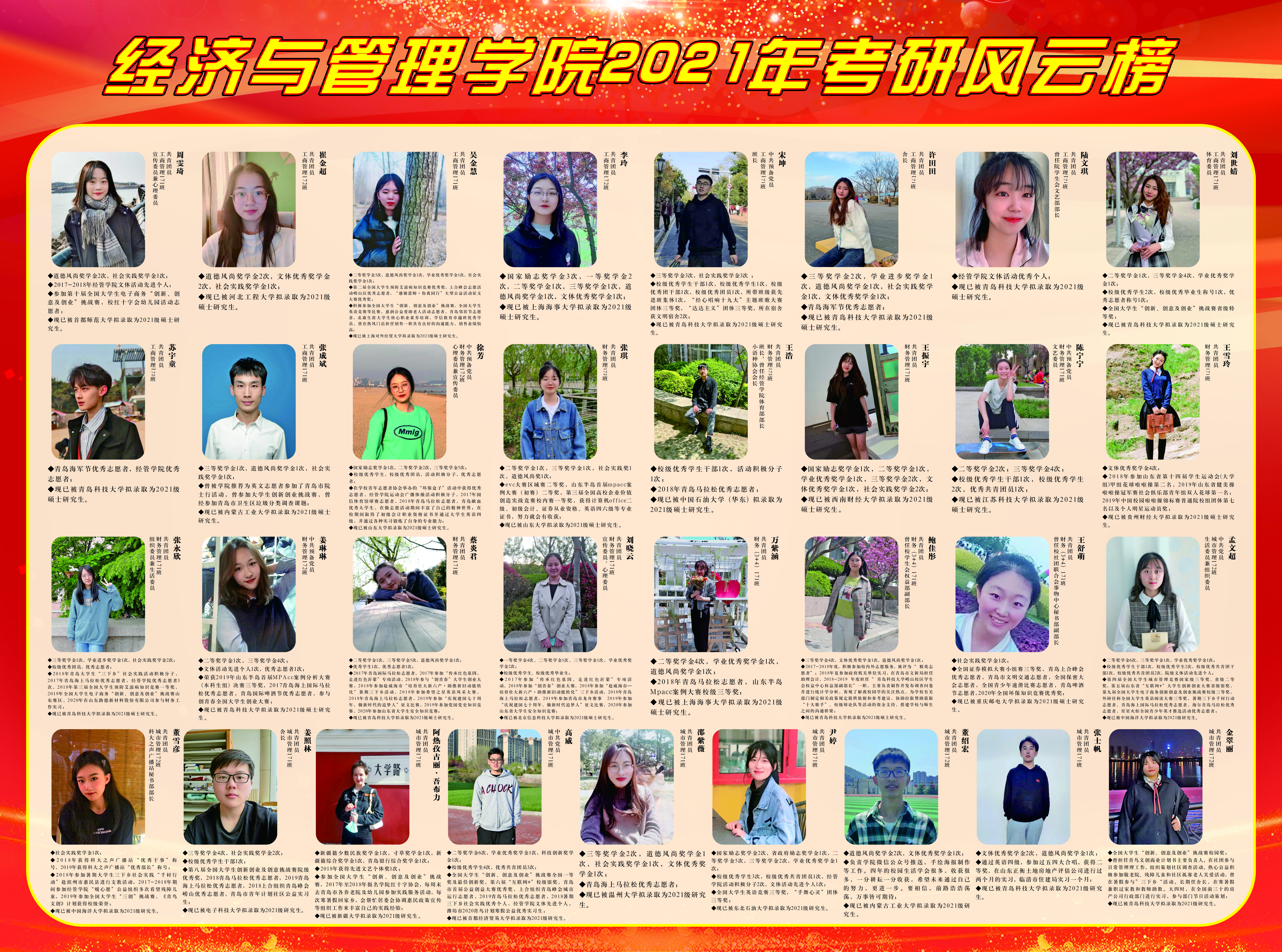 披星戴月,四季奔忙,只因理想,乘风破浪。在公司领导的大力关心与指导下,在全体教师的帮助与支持下,在全体员工的共同努力下,ylzzcom永利总站2021届毕业生在全国研究生考试中不负众望,再创佳绩。为传递优秀学子的榜样力量,弘扬学风建设正能量,ylzzcom永利总站组织考研风云榜展示活动,旨在彰显经管精神、传递经管声音。
