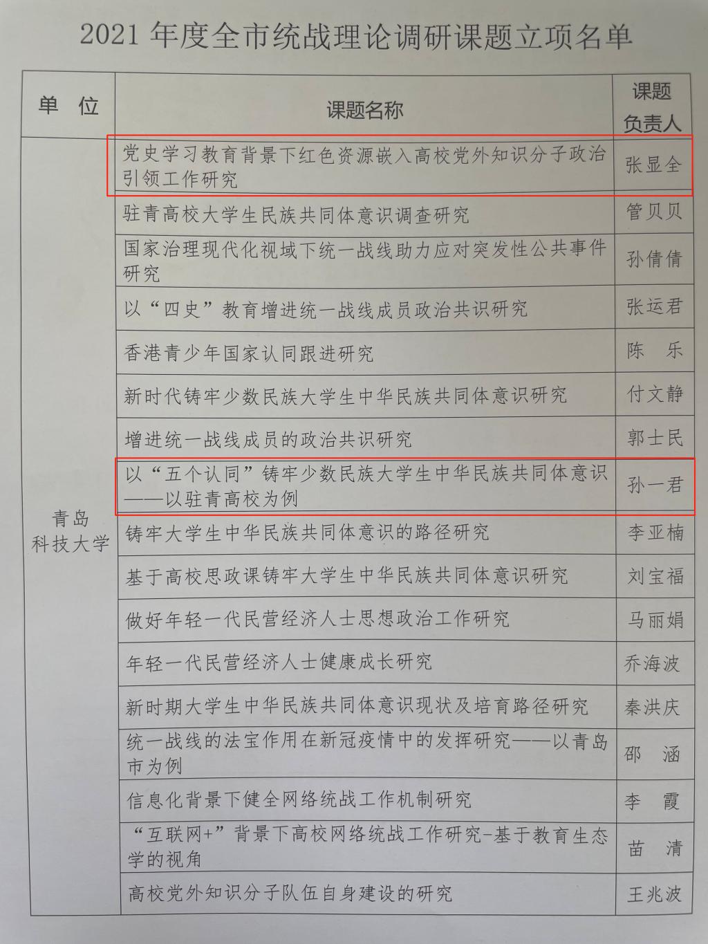 近日,中共青岛市委统战部下发《关于公布2021年度全市统战理论调研课题立项名单的通知》,根据通知精神,ylzzcom永利总站线路检测共有立项25项,其中,ylzzcom永利总站获批2项。ylzzcom永利总站申报的课题《党史学习教育背景下红色资源嵌入高公司党外知识分子政治引领工作研究》(负责人张显全)和《以“五个认同”铸牢少数民族老员工中华民族共同体意识—以驻青高校为例》(负责人孙一君),均获得2021年度统战理论调研课题立项。