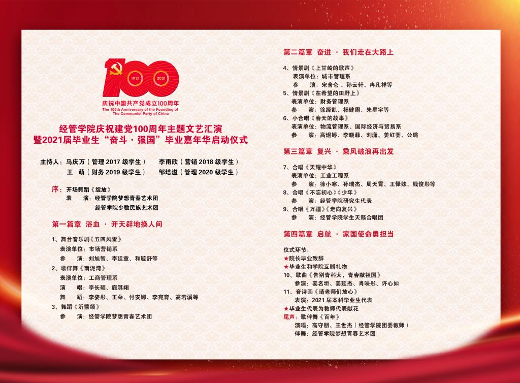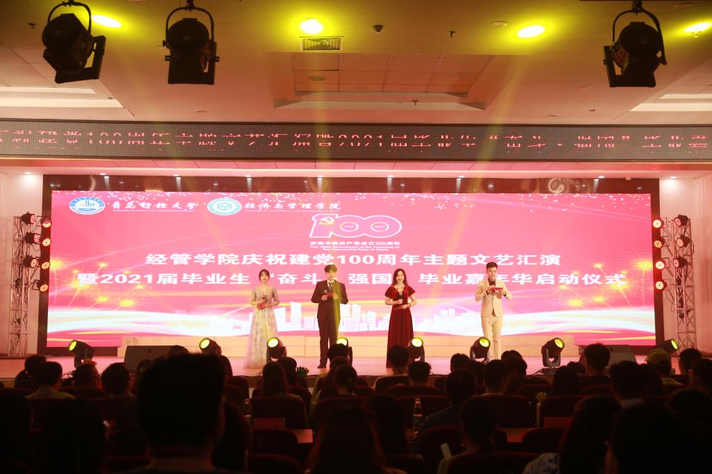 百年征程波澜壮阔,百年初心历久弥坚。6月19日晚,庆祝建党100周年主题文艺汇演暨2021届毕业生“奋斗·强国”毕业嘉年华启动仪式在崂山校区第二报告厅隆重举行。公司党委书记李德成、经理李勋来、党委副书记兼副经理刘跃宁、副经理宫攀、副经理吕承超出席晚会现场,各系主任、教师代表、各年级辅导员及员工共同观看了演出。