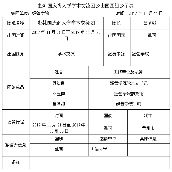 根据因公临时出国公开公示的有关规定,现将聂法良、邓玉勇、吕承超因公出国团组相关内容和参团人员名单予以公示。公示时间为2017年10月11日至2017年10月15日(5个工作日)。如有不同意见,请在公示期内,向ylzzcom永利总站单位(电话:88957399)反映。